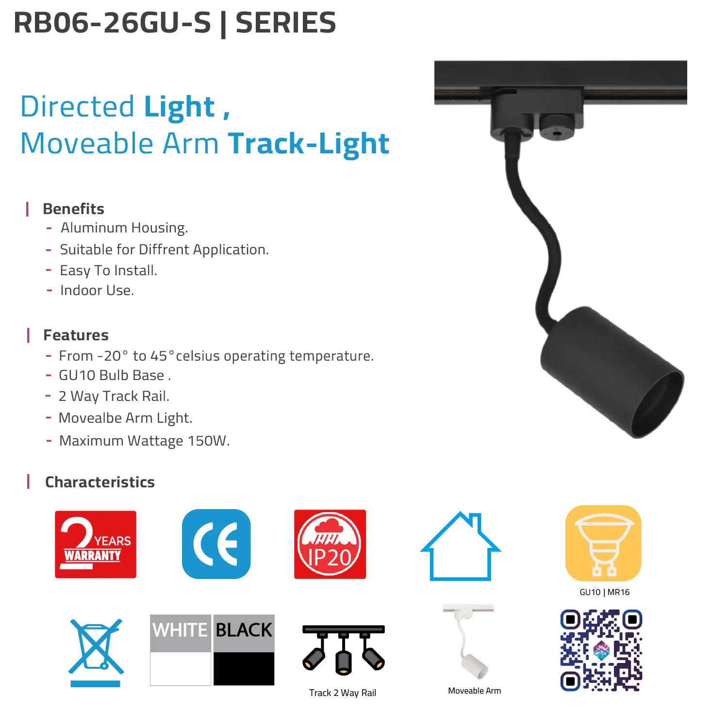 كشاف تراك لايت قاعدة GU10 – بذراع متحرك و لون أسود للاستخدام الداخلي (RB06-26GU-S)