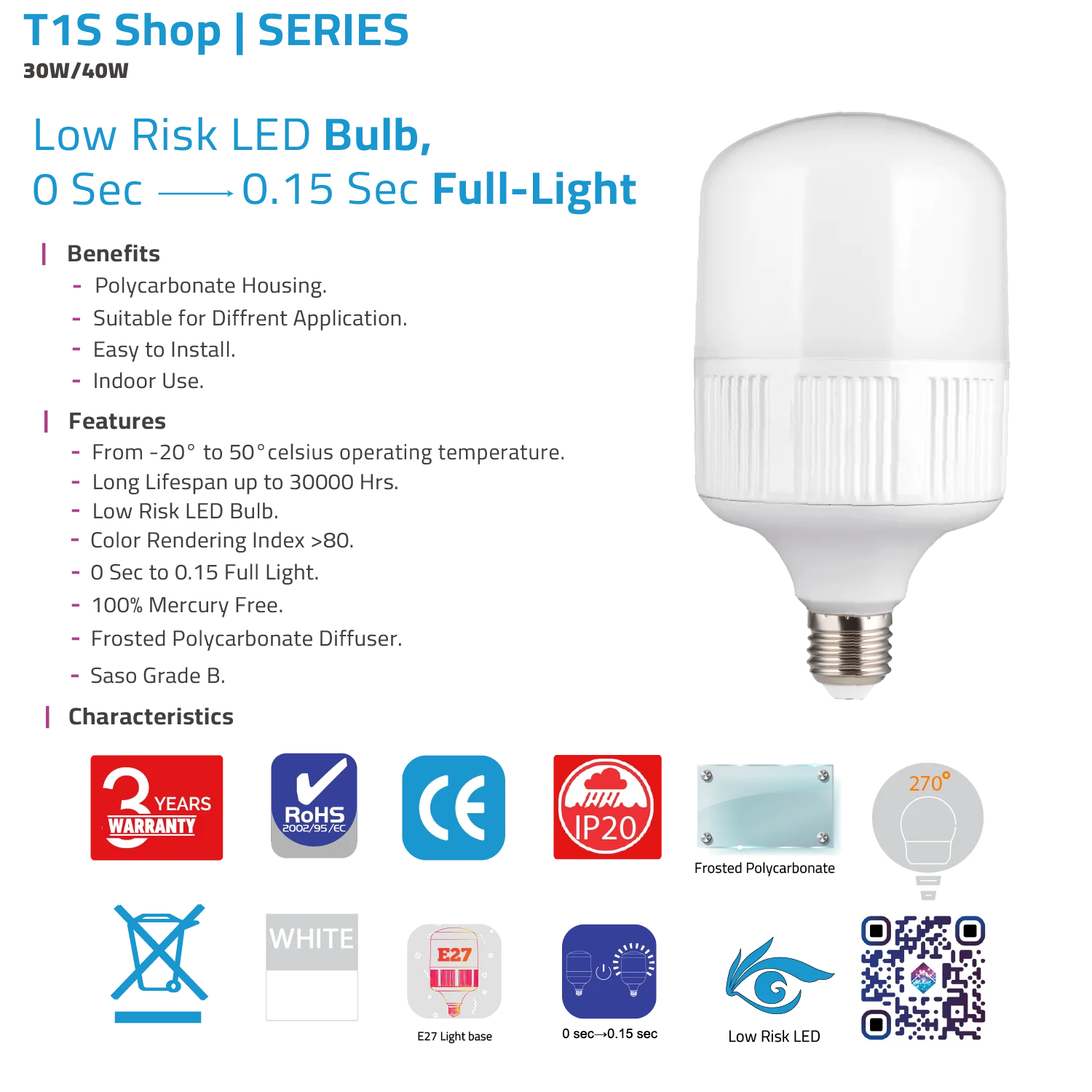 لمبة ليد للاستخدام الداخلي ، قاعدة E27 ، ضوء فوري وكفاءة عالية (T1S Shop)