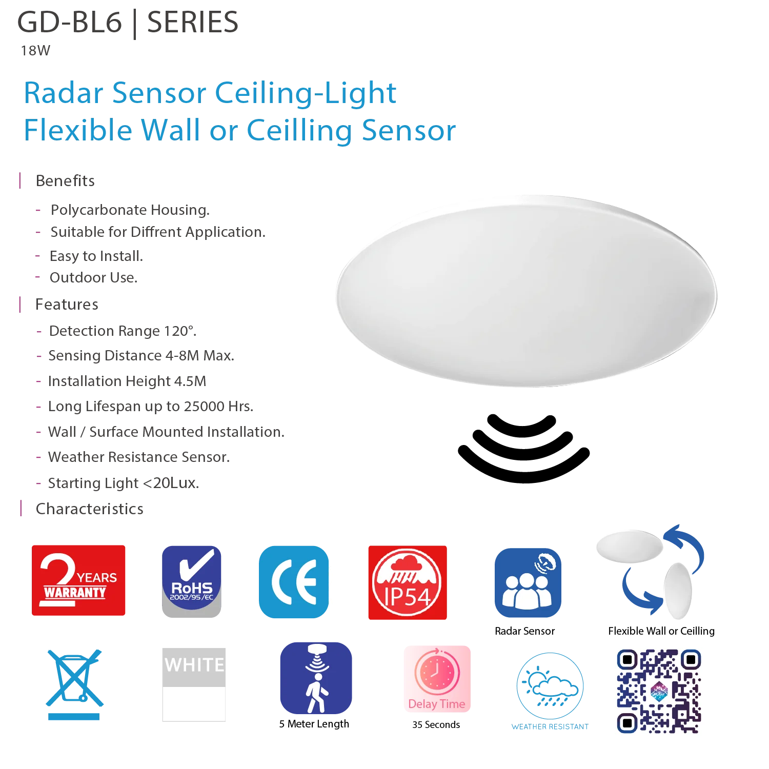 كشاف سقفي بمستشعر رادار حساس حركة 18W للداخل والخارج – مقاوم للعوامل الجوية (GD-BL6)