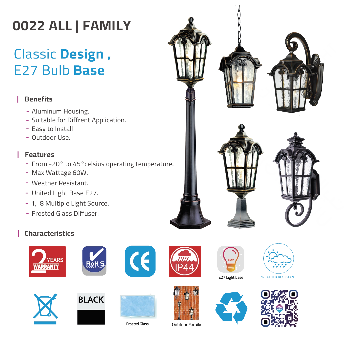 يأتي كشاف الإضاءة الخارجية من Ultra Light موديل 0022-FAMILY بتصميم كلاسيكي أنيق يعكس الرقي والجودة في مختلف المساحات الخارجية. بفضل خياراته المتعددة بين الجداري والعامود والممشى والستاند، يوفر لك مرونة عالية في التصميم مع أداء قوي لتحمل الظروف الجوية.