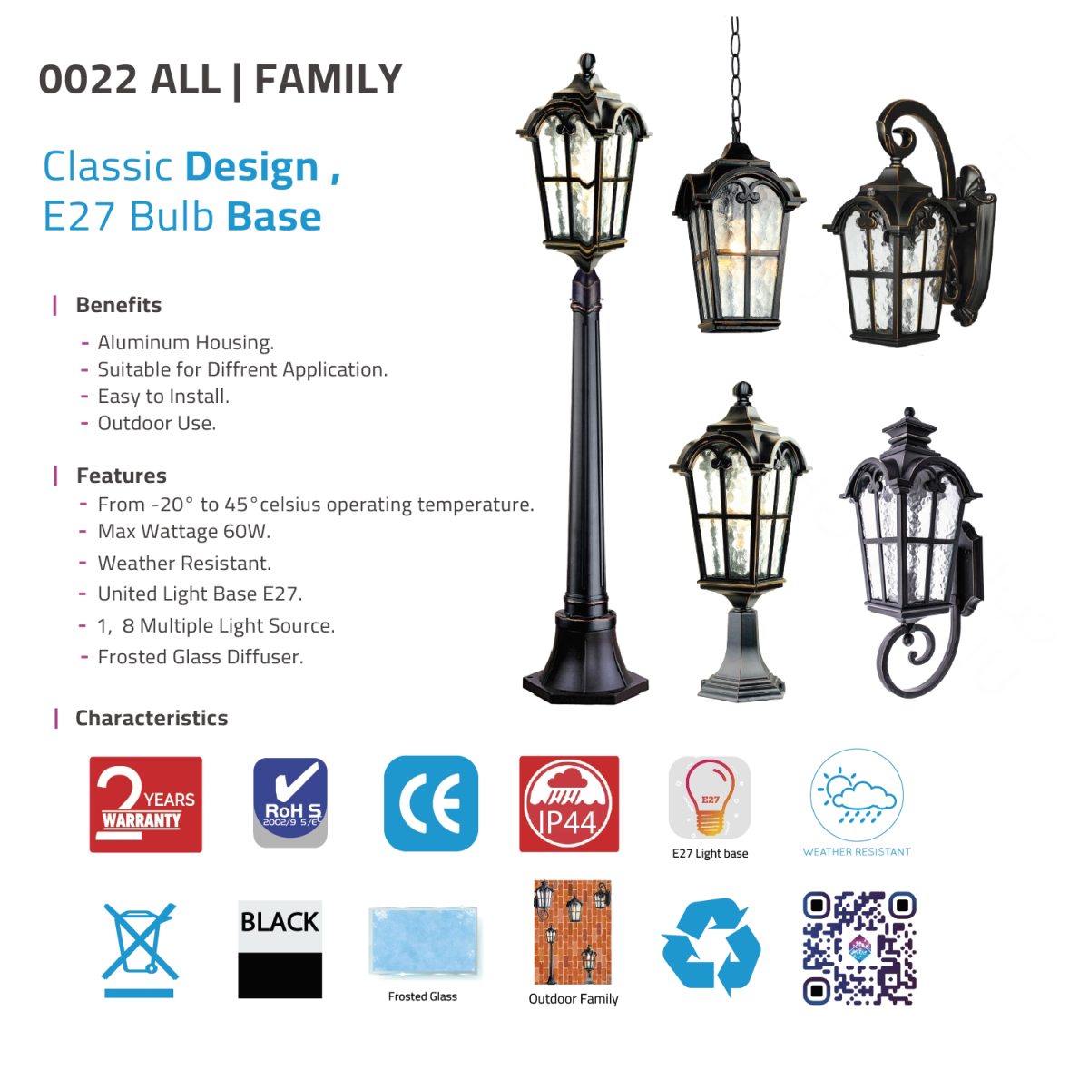 كشاف الإضاءة الخارجية الكلاسيكي E27 – أناقة خارجية وتصميم عملي (0022-FAMILY)