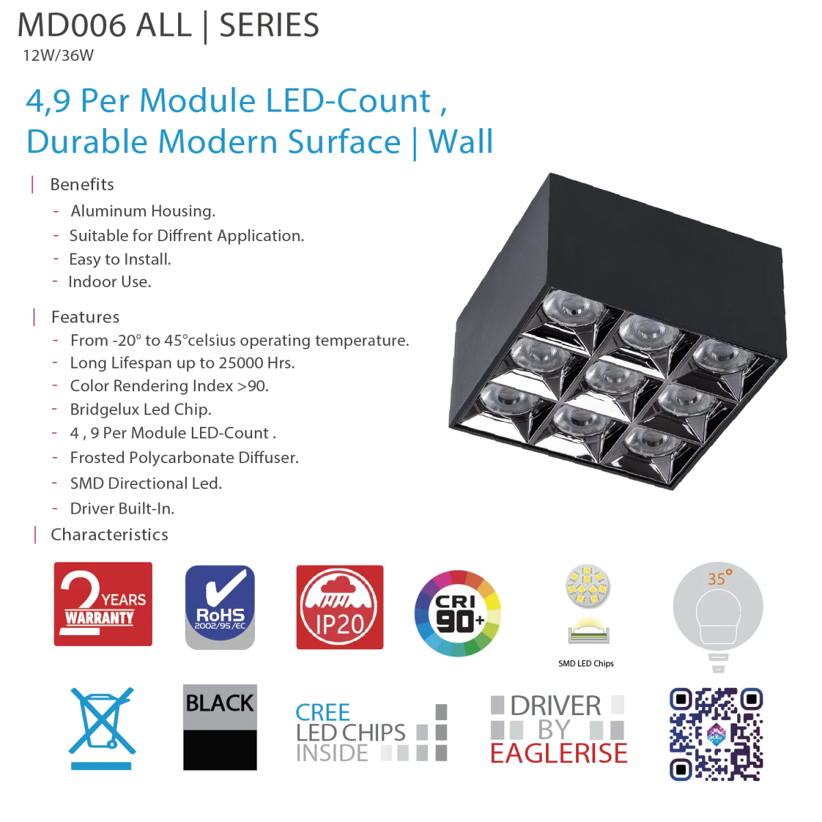 كشاف ليد جداري بتركيب سطحي عصري مع درجة وضوح ألوان عالية CRI>90 (MD006)