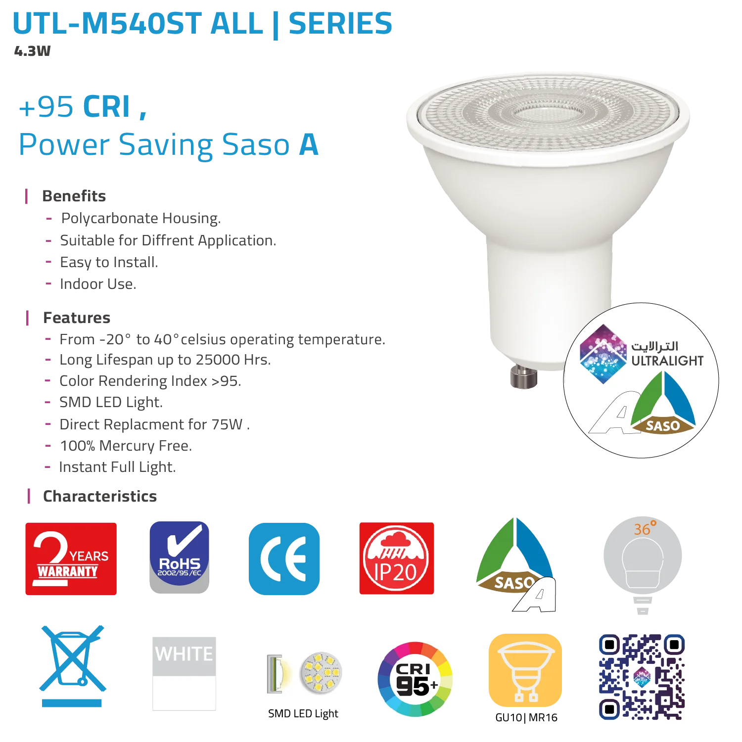 لمبة ليد الترالايت 4.3 واط - قاعدة GU10 - درجو وضوح لون عالية (UTL‑M540ST)