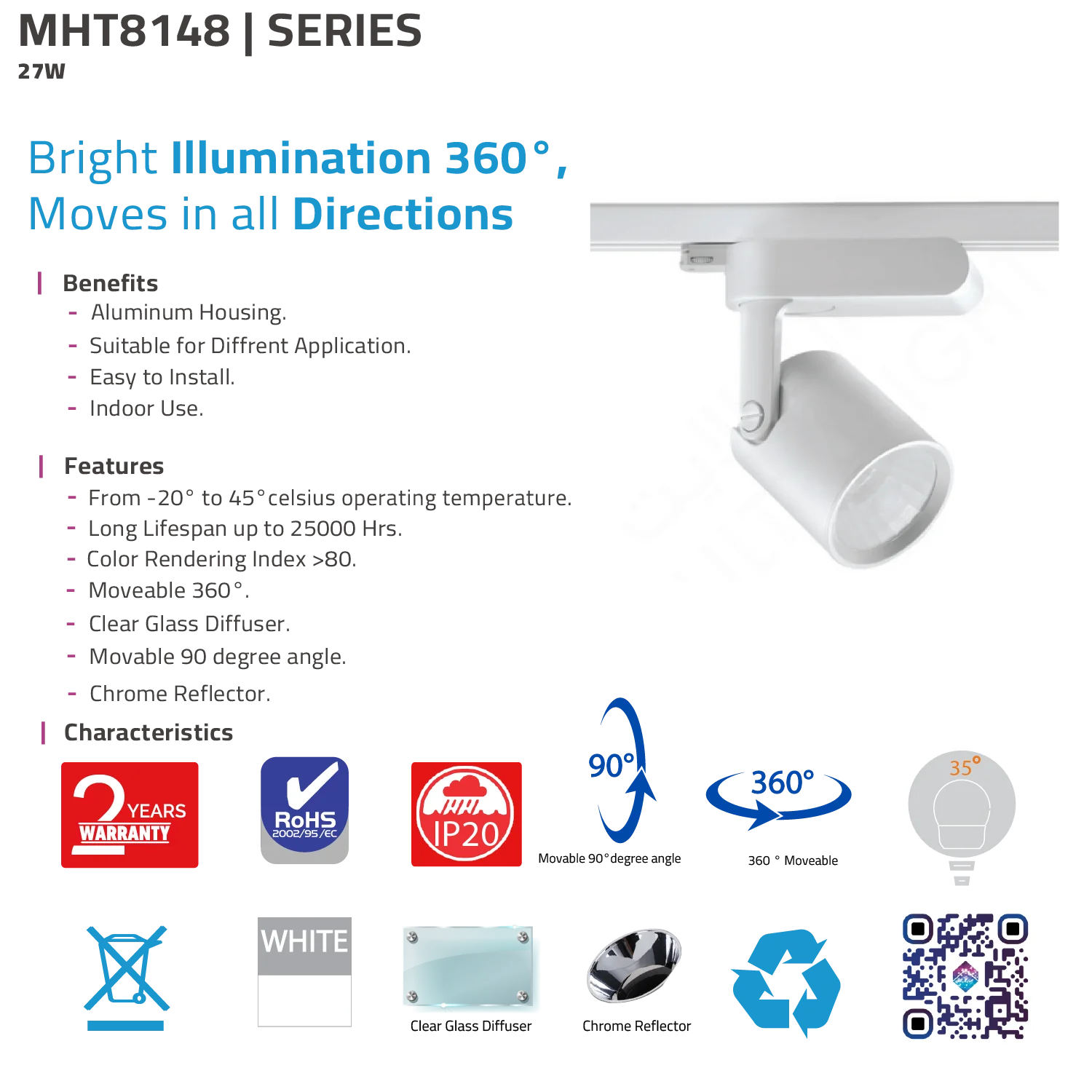 كشاف تراك لايت ليد داخلي 27 واط – قابل للتوجيه 360° – لون أبيض (MHT8148)