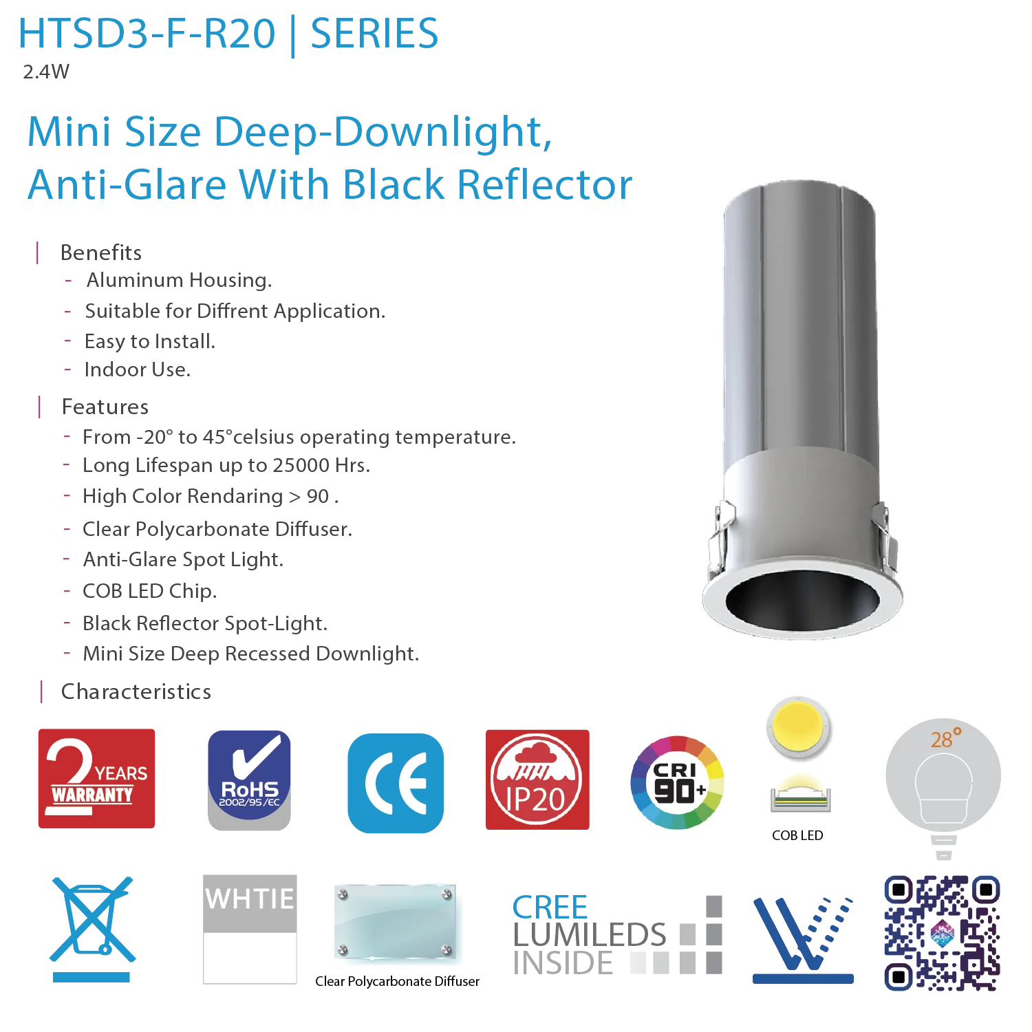 سبوت ليد غاطس صغير 2 سم مضاد للوهج 2.4 واط CRI>90 (HTSD3-F-R20)
