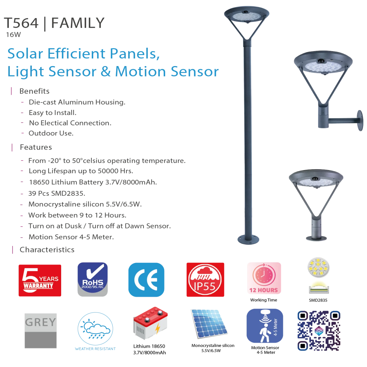 إنارة حدائق بالطاقة الشمسية الترالايت مع حساس حركة 16 واط IP55 (T564)