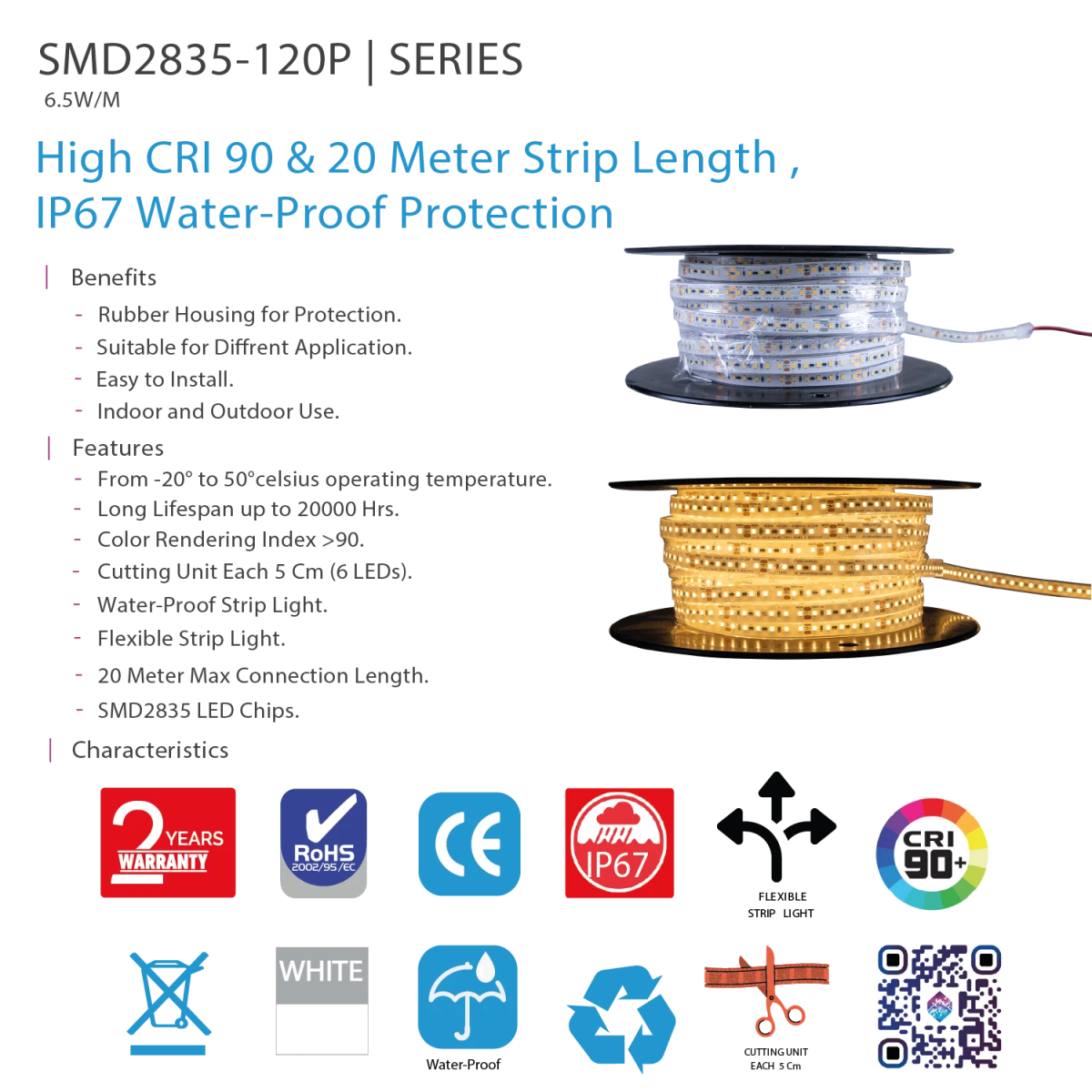 شريط إضاءة ليد مقاوم للماء – مرن وطويل للاستخدام الداخلي والخارجي (SMD2835-120P)